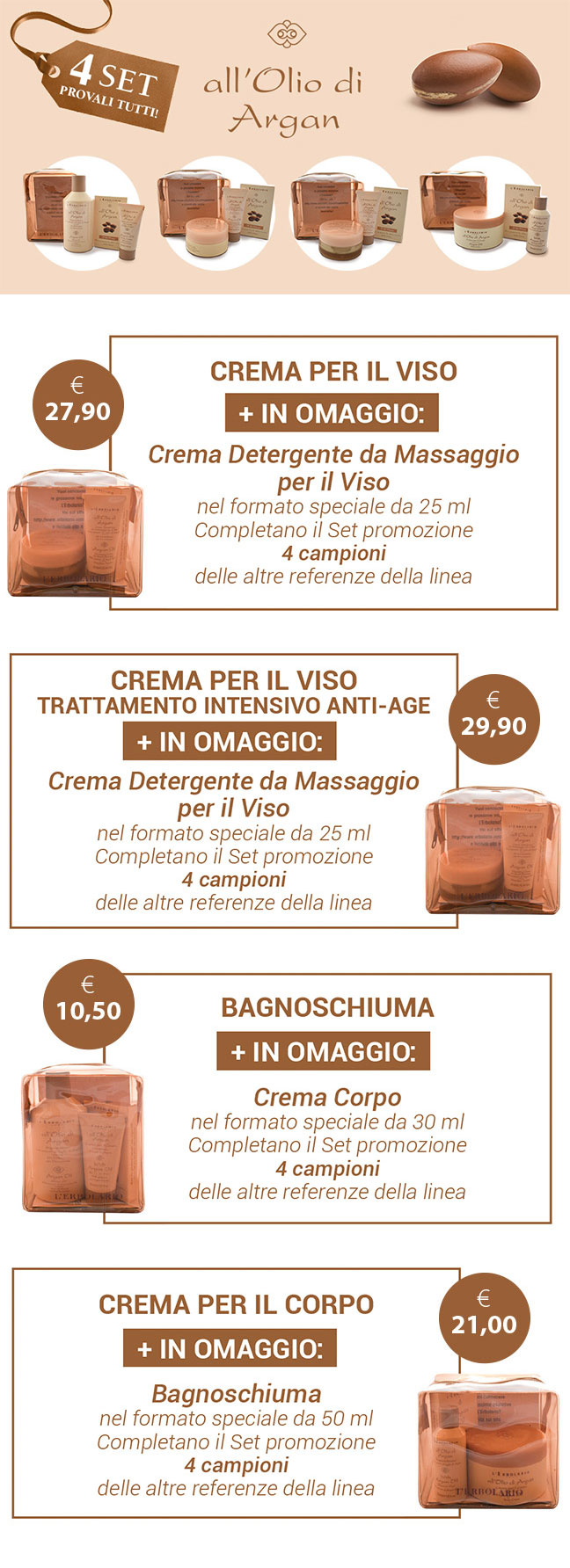 Con l’arrivo dei primi freddi la nostra pelle necessita di qualche attenzione in più e soprattutto di prodotti efficaci, che sappiano proteggerla e nutrirla: la linea all’Olio di Argan, grazie alle sue eccezionali proprietà, è il rimedio perfetto per questa esigenza! Per questo l'Erboristeria Incenso e Mirra ha creato per te una imperdibile promozione, che ti permetterà di provare le tante ricette della linea all’Olio di Argan, ad un prezzo davvero conveniente. Potrai scegliere tra quattro deliziose pochette contenenti una specialità all’Olio di Argan, con in omaggio un’altra referenza in formato speciale e un set di quattro campioni da provare, il tutto al prezzo del prodotto principale!